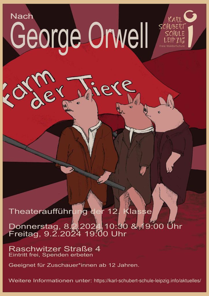 wir als 12. Klasse der Karl Schubert Schule Leipzig stehen nun kurz vor der Premiere unseres Theaterstücks “Animal Farm”. Dieses Projekt ist seit einigen Tagen in der intensiven Probephase und wir freuen uns sehr, es bald präsentieren zu dürfen. Gleichzeitig bedeutet es aber auch das baldige Ende von uns als Klassengemeinschaft. So dramatisch das klingen mag, so simpel ist es doch mit den anstehenden Abschlüssen für den Realschulzweig zu erklären (ich möchte die Gelegenheit nutzen, sowohl unserer Realschulgruppe als auch den diesjährigen Hauptabschlussprüflingen und dem Abiturjahrgang viel Glück für die kommenden Prüfungen zu wünschen)!